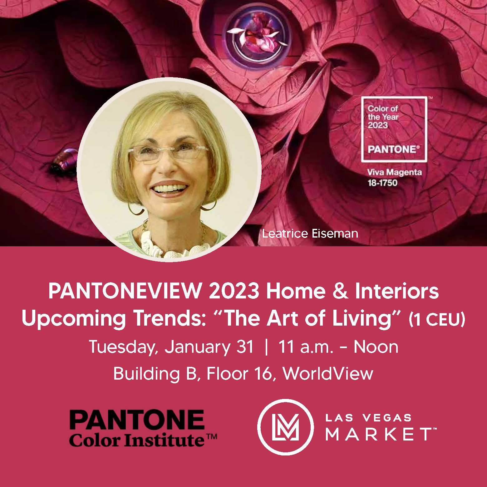Tuesday, January 31, 2023, 11:00am-12:00pmBuilding B, WorldView on Sixteen Featuring Leatrice Eiseman, Pantone Color Institute & Eiseman Center for Color Information and Training Space is limited and registration is recommended. In order to provide you the content requested, we need to store and process your personal data. We may also share your data with our authorized content providers so that you may be notified of their future service offerings directly.